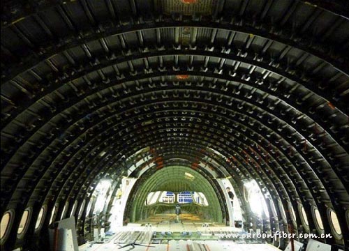 首個(gè)A350XWB前機(jī)身內(nèi)部構(gòu)造。前機(jī)身結(jié)構(gòu)采用碳纖維復(fù)合材料,正在法國(guó)圣納澤爾工廠進(jìn)行組裝。