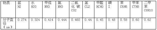 這要從三個方面來說明:第一,孔隙具有吸附勢,靠碳分子與被吸附分子的引力而形成的,孔徑越小,吸附勢越強。第二,分子運動理論:①一切物體均由分子或原子組成,分子(原子)間有間隙;②分子(原子)是處于永不停息漫無規(guī)則的熱運動狀態(tài),分子間相互碰撞很頻繁,在標準狀態(tài)下,甲醛分子的自由運動速度為450m/s,一個甲醛分子與其它分子每秒要碰撞109次/S(幾十億次);若貼近所研究表面的甲醛分子數(shù)密度,時時刻刻與遠處的甲醛分子數(shù)密度相等,則每秒有約2.7×1027個甲醛分子(約130㎏)碰在每平方米面積上;③分子間有相互作用力,一般表現(xiàn)為引力。第三,碰撞分子的直徑與活性炭纖維孔隙直徑要匹配,若分子直徑大于孔隙直徑,則分子碰活性炭纖維時,進不了孔隙而被彈回到空中;若分子直徑遠小于孔隙直徑,則分子即使碰到了孔隙,也有可能跑出來,孔徑越大,跑出來的概率也越大,使吸附率越小;當分子直徑略小于孔徑時,分子碰到孔以后難于跑出來,即被吸附了。被吸附的分子數(shù)量多,表明其吸附能力越強。經(jīng)查實與計算,某些物質(zhì)分子的有效直徑如表1所示: