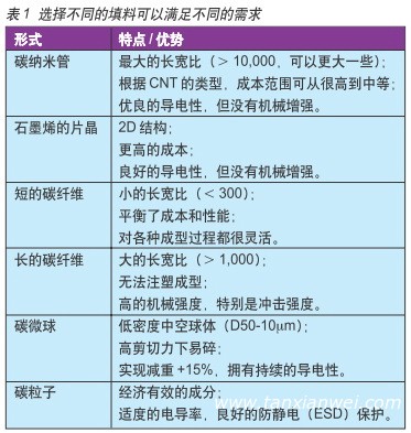 碳的加入可以是多種形式:作為碳納米管(CNT)、石墨烯的片晶、短或長的碳纖維、碳微球和簡單的碳粒子。表1總結(jié)了這些形式各自的優(yōu)勢(shì)。這些填充材料使塑料可以導(dǎo)電,以提供EMI屏蔽。大部分CNT填充塑料的電阻率能小于10嗎?以厘米計(jì),在1%至5%的填料體積和1以下?以厘米計(jì),填料體積在5%至10%。有時(shí)候,可以通過碳系填料金屬涂層來增加導(dǎo)電性。