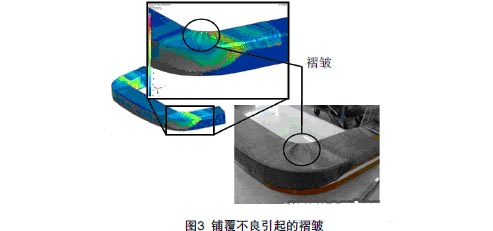 預(yù)浸料在曲面上的鋪覆過程會(huì)對(duì)增強(qiáng)體造成剪切和擠壓,從而導(dǎo)致纖維鋪設(shè)角度發(fā)生變化,當(dāng)剪切角超過預(yù)浸料的極限角時(shí)甚至可能引起褶皺(圖3)。纖維角度的 變化會(huì)引起局部熱膨脹系數(shù)和模量的改變,從而對(duì)最終的翹曲變形和殘余應(yīng)力分布造成影響。顯然,鋪覆作用的影響程度受工件幾何形貌的影響,對(duì)于曲率較大的工 件,這種作用的影響相對(duì)顯著。