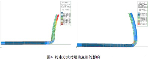 在固化變形分析中,熱膨脹與固化收縮決定了預(yù)浸料應(yīng)變能的水平,而預(yù)浸料的約束方式則直接決定了殘余應(yīng)力在結(jié)構(gòu)上的分布狀態(tài)。殘余應(yīng)力在厚度方向上分布的 不平衡導(dǎo)致了結(jié)構(gòu)的翹曲變形。圖4為采用相同預(yù)浸料,經(jīng)歷相同的溫度歷程,在不同約束方式下的兩個(gè)L型件的變形計(jì)算結(jié)果。左圖L 型件外側(cè)施加全約束,固化結(jié)束后釋放約束;右圖L型件內(nèi)側(cè)施加全約束,固化結(jié)束后釋放約束??梢?,采用不同的約束方式將顯著影響最終的變形結(jié)果。
