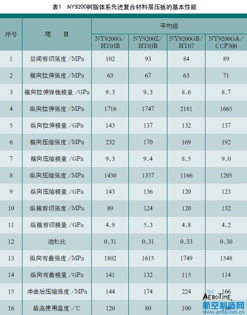 為提高和穩(wěn)定先進(jìn)復(fù)合材料的成型質(zhì)量,降低先進(jìn)復(fù)合材料的制造成本,我們根據(jù)不同的復(fù)合材料結(jié)構(gòu)件研制開發(fā)了中高溫度固化、韌性不同的NY9200環(huán)氧樹脂體系,原材料均為國(guó)產(chǎn),價(jià)廉易購(gòu);其配制工藝簡(jiǎn)單,質(zhì)量穩(wěn)定,可用于濕法或干法預(yù)浸,無污染,易工程化;其預(yù)浸料具有貯存期長(zhǎng),固化溫度帶寬,固化時(shí)間短等優(yōu)點(diǎn);其先進(jìn)復(fù)合材料具有韌性和機(jī)械性能兼優(yōu)的特性,完全可滿足使用溫度為80~130℃的國(guó)內(nèi)先進(jìn)復(fù)合材料對(duì)樹脂基體的要求。其先進(jìn)復(fù)合材料層壓板的基本性能如表1所示。