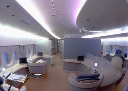 空中客車A380的機(jī)艙配備了為客機(jī)研發(fā)的最先進(jìn)的機(jī)上娛樂系統(tǒng),光纖配電網(wǎng)絡(luò)使電影、視頻游戲和電視節(jié)目的選擇更加靈活完備。在飛機(jī)上乘客還 可以使用便攜式計(jì)算機(jī)和打電話。有更多的開放空間,比如商務(wù)中心。底艙可選擇為設(shè)置休息區(qū)、商務(wù)區(qū)、酒吧或其它的娛樂區(qū),按照不同航空公司的需求,還可安 排其它設(shè)施,如理發(fā)店、臥鋪、賭場(chǎng)、按摩室或兒童游戲場(chǎng)。寬大的空間可供頭等艙內(nèi)安排私人套間,甚至包括淋浴設(shè)施的浴室。 123456