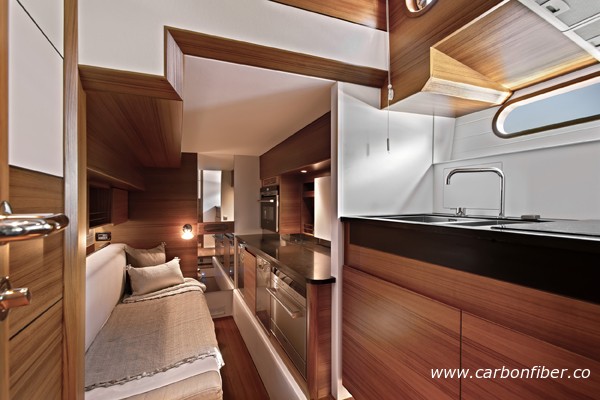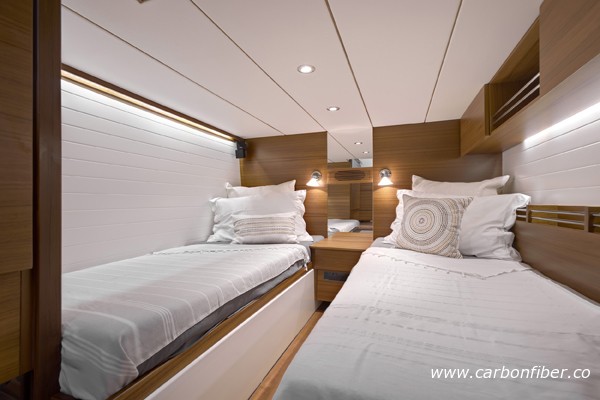 據(jù)了解,目前市場上很多船都標(biāo)榜“碳纖維”,但事實(shí)上大部分都只有小區(qū)域用了碳纖維而其他區(qū)域只是一般的纖維組合。Delta 54 是全球第一艘100%使用碳纖維的游艇,除了船體外,室內(nèi)柜子門、隔艙板及地板等附屬設(shè)施均由碳纖維打造。