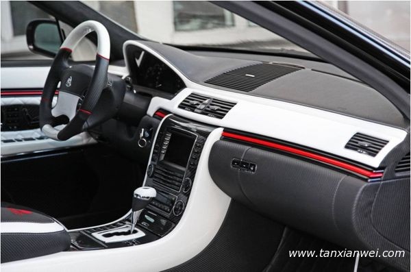 對(duì)于車身的改裝添加的部件全部采用了碳纖維材料,包括:前后擋板,新的發(fā)動(dòng)機(jī)罩 ,行李箱蓋,車尾擴(kuò)散器和后擾流板,另外還未它配備了LED日間行車燈以及24寸輪轂。輪轂的表面經(jīng)過(guò)碳處理,并配以白色剎車卡鉗形成了強(qiáng)烈的對(duì)比。