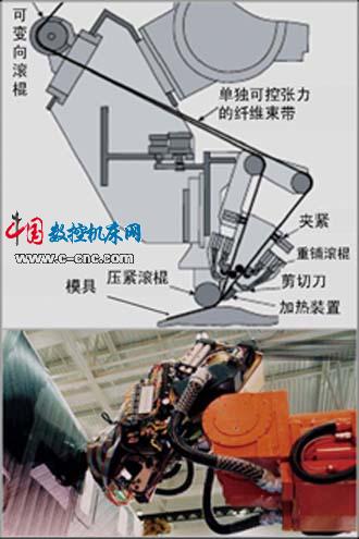 機床纏繞功能和ATL機床層鋪、壓緊、切割和重鋪等加工能力融合集成在一臺設(shè)備上,此即出現(xiàn)了自動纖維鋪放機床(AFP),也叫自動鋪絲機。