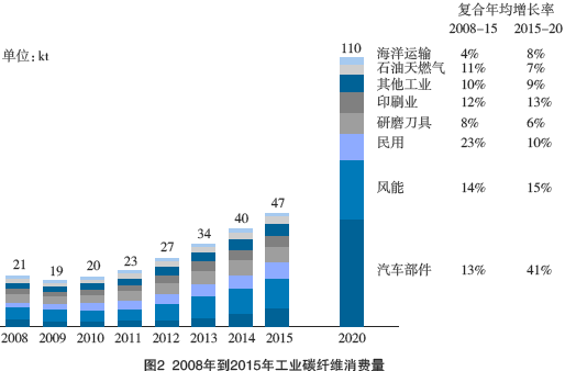 2010年,包括體育休閑和宇航在內(nèi)的工業(yè)應(yīng)用大約消耗了總產(chǎn)量31000t中的20000t,已占到碳纖維消費(fèi)量的2/3(見(jiàn)圖1)。到2015年,體育休閑消費(fèi)量將超過(guò)7000t/年,同時(shí)工業(yè)消費(fèi)量應(yīng)從20000t/年增長(zhǎng)到47000t/年,到2020年,甚至達(dá)到110000t/年(見(jiàn)圖2)。從中期看,風(fēng)電葉片可能是碳纖維需求的主要?jiǎng)恿?,而從長(zhǎng)期看,汽車行業(yè)將促進(jìn)碳纖維的需求。僅靠汽車行業(yè)就能改變碳纖維復(fù)合材料生產(chǎn)企業(yè)的面貌。 本文來(lái)自123