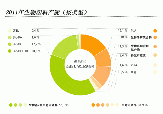 圖2:2011年不同類型的生物塑料的產(chǎn)能(數(shù)據(jù)來源:歐洲生物塑料協(xié)會(huì)、漢諾威大學(xué)應(yīng)用科學(xué)和藝術(shù)學(xué)院、IfBB—生物塑料和生物復(fù)合材料學(xué)會(huì))
