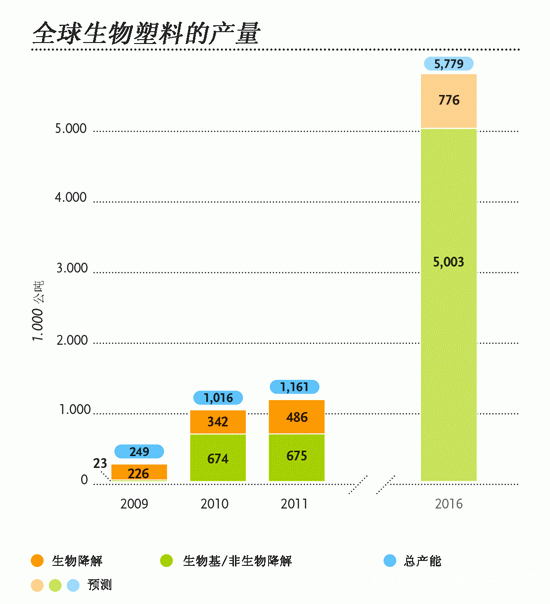 基于可再生原材料的塑料產(chǎn)量已經(jīng)有了快速的提升,雖然其總體水平相對(duì)于石油基塑料來說還比較低。據(jù)制造商協(xié)會(huì)European Bioplastics報(bào)道,2009年,生物降解塑料的產(chǎn)量大約有幾十萬噸,占生物塑料全球總產(chǎn)能的絕大部分份額。但是自2010年以來,生物基塑料的增長速度已經(jīng)遠(yuǎn)遠(yuǎn)超過生物降解塑料。據(jù)該協(xié)會(huì)預(yù)測,盡管生物降解塑料的產(chǎn)量在不斷增長,但到2016年,它們大約只能占到生物塑料總產(chǎn)量的七分之一。生物塑料中絕大部分將是生物基塑料,而不是生物降解塑料。 123456
