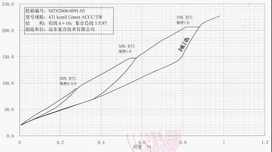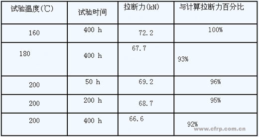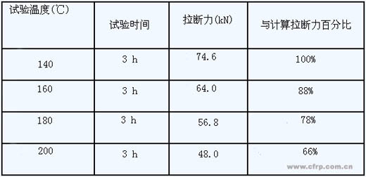 結(jié)果表明,碳纖維復(fù)合芯經(jīng)過不同加熱溫度和不同加熱時(shí)間后,恢復(fù)正常溫度后,芯仍能保持不小于90%計(jì)算拉斷力的拉力。