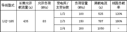 原LGJ-185導(dǎo)線只能滿足帶一個(gè)變電所2臺(tái)主變的要求,遇故障或檢修,帶3臺(tái)50MVA主變,需輸送787A,LGJ-185導(dǎo)線就已不能承擔(dān)。導(dǎo)線輸送容量的限制給電網(wǎng)運(yùn)行方式的靈活調(diào)整帶來困難。