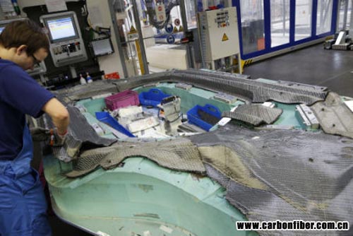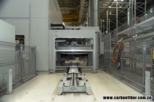 碳纖維材料被運往寶馬在德國瓦爾斯多夫的零部件加工廠,然后根據(jù)需要紡織成各種各樣的結(jié)構(gòu)和樣式;再接著工作人員把這些半成品送往萊比錫和蘭茨胡特的碳纖維增強(qiáng)復(fù)合材料沖壓車間,完成碳纖維軟性板材(類似坐墊、地毯)的制造。通過各種加工機(jī)械,碳纖維板材被切割成各種不同的大小和形狀,然后再利用熱處理或塑料粉末高壓粘合技術(shù),把這些板件加工出立體構(gòu)型。加工成型階段,每一次三個形狀完全相同的碳纖維板件要重疊在一起,這樣可以有效地降低在最終的樹脂傳遞成型過程中材料發(fā)生撕裂的可能性。