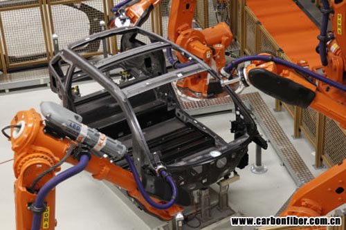 在樹脂傳遞成型階段之后,利用水激光切割技術(shù)完成碳纖維增強(qiáng)復(fù)合材料部件上的嵌入空和邊緣剪裁加工;接著在最新的全自動化車身車間中,所有部件進(jìn)行過表面磨砂處理,增加粘附性后,結(jié)合為一個穩(wěn)固整體。