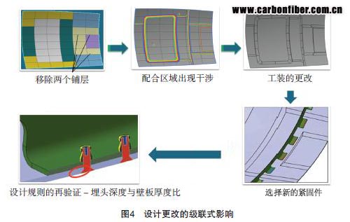 對于設(shè)計(jì)流程,設(shè)計(jì)更改是無處不在的,并且是一定會做設(shè)計(jì)更改的。那么設(shè)計(jì)更改的影響是什么呢?考慮機(jī)身壁板中蒙皮厚度變化和基礎(chǔ)結(jié)構(gòu)位置移動的連鎖影響。圖4說明的是由于簡單的鋪層的變化帶來的一系列的設(shè)計(jì)更改。