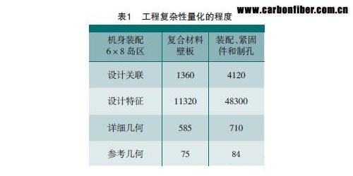 事實(shí)上,我們嘗試著量化大型航空結(jié)構(gòu)復(fù)合材料壁板的復(fù)雜性。舉個例子,對于一個由桁條和框分割的包含6×8 個島區(qū)的典型商用飛機(jī)的的航空壁板,得到如表1 所示的一組統(tǒng)計(jì)數(shù)字。創(chuàng)建了幾何參考并且保留在CAD 環(huán)境中。細(xì)節(jié)的幾何元素手動創(chuàng)建但沒有在三維CAD 環(huán)境中提交并確認(rèn)。除了幾何數(shù)據(jù),對于復(fù)合材料蒙皮有11320 個非幾何特征,對于裝配件、緊固件、孔等有48300 個非幾何特征。這些特征不屬于三維CAD 或者PLM 的一部分。另外,這些關(guān)系沒有在三維CAD 或者PLM 中捕獲,也沒有在設(shè)計(jì)意圖中體現(xiàn)。在CAD 和PLM 軟件中有超過90% 的數(shù)據(jù)沒有捕獲并且沒有有效管理。 本文來自123