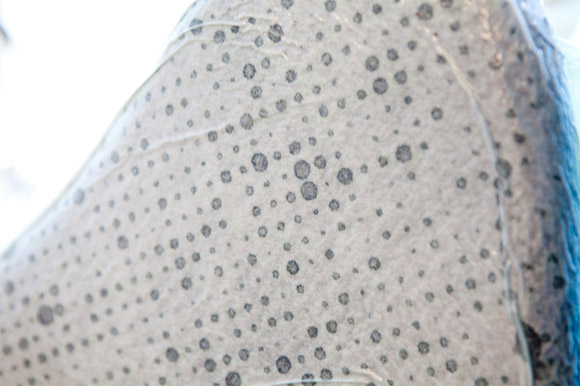 For the medium cure epoxy selected, pot life ranged from 20-25 minutes. This was not much time to get all laminate layers wet and laid on our foam plug. The back layers were wetted first. We decided the best way to wet the layers was to lay both cloth layers inside an oversized vacuum bag and to place resin in between the layers inside the bag. Then the resin was spread throughout the cloth from the outside of the vacuum bag using the plastic squeegee. Once the cloth was fully wetted, it was immediately removed from the bag and placed on the foam. 123456