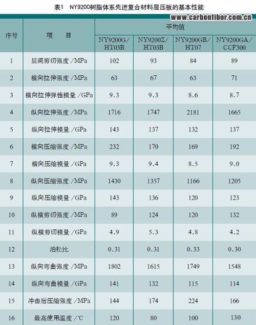 為提高和穩(wěn)定先進(jìn)復(fù)合材料的成型質(zhì)量,降低先進(jìn)復(fù)合材料的制造成本,我們根據(jù)不同的復(fù)合材料結(jié)構(gòu)件研制開發(fā)了中高溫度固化、韌性不同的NY9200環(huán)氧樹脂體 系,原材料均為國產(chǎn),價(jià)廉易購;其配制工藝簡單,質(zhì)量穩(wěn)定,可用于濕法或干法預(yù)浸,無污染,易工程化;其預(yù)浸料具有貯存期長,固化溫度帶寬,固化時(shí)間短等 優(yōu)點(diǎn);其先進(jìn)復(fù)合材料具有韌性和機(jī)械性能兼優(yōu)的特