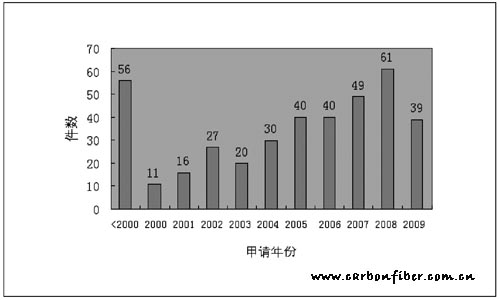 圖1 2009年以前我國碳纖維專利申請情況