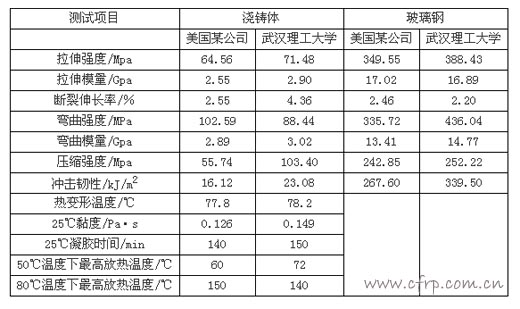 6.2 為改善工藝性,建議采用武漢理工大學(xué)材料學(xué)院復(fù)合材料系研發(fā)的高性能低黏度環(huán)氧樹脂。其已開發(fā)的樹脂玻璃化溫度(Tg)達(dá)190℃,黏度可低到80mPa•s,浸漬性大為提高。下面是武漢理工大學(xué)與美國(guó)某公司環(huán)氧樹脂實(shí)物的測(cè)試結(jié)果,可資比較參考。