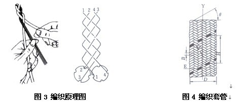 編織是一種古老的織造技術(shù)。編織物(braid)所有的纖維均斜交,與軸線夾角不呈0°與90°。編織原理與編織管如圖3、圖4所示。編織過程腫,纖維的運(yùn)動(dòng)軌跡為螺旋線。選擇合理的纖維角度可調(diào)節(jié)成品管材徑向強(qiáng)度與軸向強(qiáng)度的比例;選擇適宜的纖維排列密度可滿足強(qiáng)度與外觀的要求。