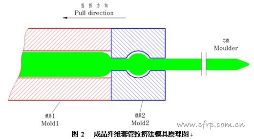 成品纖維套管拉擠法的模具原理如圖2所示。芯模左端以球形部分定位,使之軸向定位。