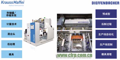 德國加工機械領域的專家迪芬巴赫公司(Dieffenbacher)和克勞斯瑪菲公司(KraussMaffei)在RTM技術領域展開了合作,他們對以上的市場需求做出了響應——開發(fā)了一條高壓樹脂傳遞模塑成型工藝(HP-RTM)的自動化生產線。這條生產系統包括了預成型加工、壓制過程,以及修整工藝。相比于傳統的RTM工藝,該HP-RTM工藝減少了樹脂注射次數,提高了預制件的浸漬質量,并縮短了成型周期。