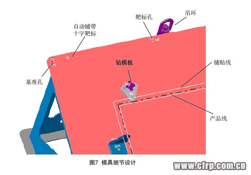 (6) 復(fù)材制件定位孔:也叫制件工藝耳片孔,用于復(fù)材制件在脫模后檢測、機(jī)加和裝配時作定位基準(zhǔn),精度要求高。此孔需要有相應(yīng)的鉆模板來準(zhǔn)確定位,鉆孔需要在脫模前進(jìn)行,孔應(yīng)該在模具的法線方向。 本文來自123