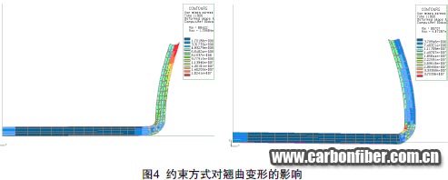 在固化變形分析中,熱膨脹與固化收縮決定了預(yù)浸料應(yīng)變能的水平,而預(yù)浸料的約束方式則直接決定了殘余應(yīng)力在結(jié)構(gòu)上的分布狀態(tài)。殘余應(yīng)力在厚度方向上分布的不平衡導(dǎo)致了結(jié)構(gòu)的翹曲變形。圖4為采用相同預(yù)浸料,經(jīng)歷相同的溫度歷程,在不同約束方式下的兩個(gè)L型件的變形計(jì)算結(jié)果。左圖L 型件外側(cè)施加全約束,固化結(jié)束后釋放約束;右圖L型件內(nèi)側(cè)施加全約束,固化結(jié)束后釋放約束??梢姡捎貌煌募s束方式將顯著影響最終的變形結(jié)果。