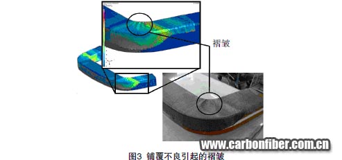 預(yù)浸料在曲面上的鋪覆過程會(huì)對(duì)增強(qiáng)體造成剪切和擠壓,從而導(dǎo)致纖維鋪設(shè)角度發(fā)生變化,當(dāng)剪切角超過預(yù)浸料的極限角時(shí)甚至可能引起褶皺(圖3)。纖維角度的變化會(huì)引起局部熱膨脹系數(shù)和模量的改變,從而對(duì)最終的翹曲變形和殘余應(yīng)力分布造成影響。顯然,鋪覆作用的影響程度受工件幾何形貌的影響,對(duì)于曲率較大的工件,這種作用的影響相對(duì)顯著。