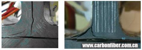 在整體化結(jié)構(gòu)接頭內(nèi)部,由于載荷傳遞路徑的特殊性,有可能形成不容忽視的層間應(yīng)力區(qū)(包括層間正應(yīng)力和層間剪切應(yīng)力)。該區(qū)層間應(yīng)力在量值上可能小于結(jié)構(gòu)承受的面內(nèi)應(yīng)力,但由于復(fù)合材料對層間應(yīng)力的敏感性,破壞則往往由此開始產(chǎn)生(圖2)。層間應(yīng)力導(dǎo)致的破壞模式是整體化結(jié)構(gòu)接頭的一個重要力學(xué)行為特點(diǎn)。有關(guān)接頭承載能力的評估需給予特殊關(guān)注。