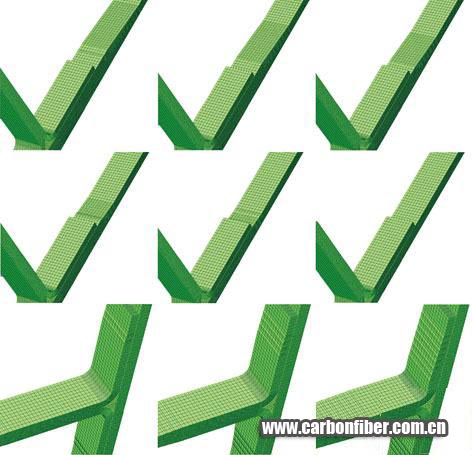 自動建模算法須能根據(jù)一系列給定的幾何參數(shù)和鋪層參數(shù),為接頭內(nèi)每一鋪層(包括插層)和每一填充區(qū)構(gòu)建合理的分析網(wǎng)格,同時滿足各鋪層網(wǎng)格相互結(jié)合部的節(jié)點(diǎn)共有要求。此外,需能準(zhǔn)確構(gòu)建每個單元的材料坐標(biāo)系。圖4給出通過專門設(shè)計的算法,在模擬接頭突緣和突緣區(qū)底板內(nèi)部增減插層對承載能力影響作用的計算過程中,自動生成了部分模型示意圖。 copyright 123456