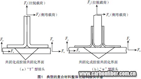 復(fù)合材料結(jié)構(gòu)件中,不同結(jié)構(gòu)組分可通過共固化或膠接共固化途徑結(jié)為一體,以取代緊固件連接方式。此狀態(tài)下,在共固化或膠接共固化界面周邊,形成一個特殊的接頭區(qū)。所謂復(fù)合材料整體化結(jié)構(gòu),即為內(nèi)含此類接頭的復(fù)合材料結(jié)構(gòu)型式,圖1給出了典型接頭及其載荷示意。