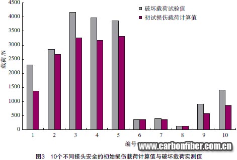 以初始損傷載荷還是破壞載荷來表征接頭的承載能力,也是接頭力學(xué)行為模擬涉及的一個具體問題。對破壞載荷的預(yù)測不存在特殊的技術(shù)困難。實(shí)際上,描述復(fù)合材料破壞過程的各種算法模型在許多工作中得到應(yīng)用。但時間耗費(fèi)是破壞載荷計算的一個主要問題。當(dāng)分析目標(biāo)是一個給定的結(jié)構(gòu)案例時,計算時間的影響作用并不凸現(xiàn)。但當(dāng)分析目標(biāo)是結(jié)構(gòu)參數(shù)變化的影響作用評估或結(jié)構(gòu)方案的優(yōu)化時,由于涉及大量案例的反復(fù)計算,采用破壞載荷作為承載能力表征會使計算時間的耗費(fèi)變得難以接受。在這種情況下,建議采用初始損傷載荷作為目標(biāo)函數(shù)。初始損傷載荷和破壞載荷分別處于破壞過程兩端,一般情況下兩者之間會存在差異,差異的幅度也隨結(jié)構(gòu)參數(shù)和載荷條件的不同而變化。但就結(jié)構(gòu)方案的比較而言,初始損傷載荷的計算值可以切實(shí)反映承載能力的優(yōu)劣狀況。圖3給出一系列不同形式、不同參數(shù)、不同載荷形式的接頭案例,由試驗(yàn)測得的破壞載荷與通過計算得到的初始損傷載荷。從圖3可見,在案例承載能力的橫向比較上,初始損傷載荷計算值和破壞載荷實(shí)測值反映了基本一致的優(yōu)劣態(tài)勢。
