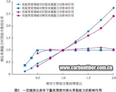 圖5為一原始接頭方案,在給定鋪層比條件下增減其填充區(qū)周邊突緣疊層厚度或底板疊層厚度,承載能力所受影響作用的模擬結(jié)果??梢钥吹?,接頭結(jié)構(gòu)參數(shù)在一定范圍內(nèi)變化可對承載能力形成顯著影響,并且影響作用會隨載荷形式的不同而發(fā)生明顯差異。由于本文的綜述性質(zhì),此處不對影響作用的具體細(xì)節(jié)進(jìn)行討論,僅通過圖例表明其復(fù)雜性。同時表明,對于接頭的合理設(shè)計,模擬結(jié)果可提供方向性的參數(shù)修正依據(jù)。