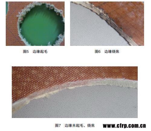 芳輪纖維目前是復(fù)合材料中機械加工最難的材料,特別容易分層、起毛。選用的刀具不合適,會使切割后的邊緣分層、起毛、燒焦等。如圖5、6、7所示。