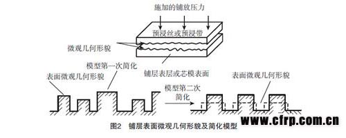 鋪層間緊密接觸度被定義為:在任意給定時(shí)間,兩鋪層接觸面積占鋪層面積總面積的百分比,與溫度、壓力、接觸時(shí)間有關(guān)[17]。由于表面粗糙度的原因,預(yù)浸絲或預(yù)浸帶表面與鋪層表面(或芯模表面)的微觀幾何形貌為不規(guī)則體,在未加熱和未施加壓力的條件下,預(yù)浸絲或預(yù)浸帶表面與鋪層表面(或芯模表面)不可能完全接觸。為理論計(jì)算方便,國(guó)外研究人員首先將不規(guī)則的微觀幾何體簡(jiǎn)化成大小不同的矩形(指截面),然后再將上述矩形簡(jiǎn)化成大小相同的矩形[18-20]。纖維鋪放過(guò)程中,在加熱到一定溫度時(shí),當(dāng)壓輥對(duì)預(yù)浸絲或預(yù)浸帶施加一定的鋪放壓力后,預(yù)浸絲或預(yù)浸帶與鋪層表面(或芯模表面)的突起的矩形將發(fā)生變形,矩形高度將減小,寬度將增大,然后根據(jù)這一模型,建立計(jì)算鋪放壓力與鋪層間緊密接觸度之間的函數(shù)關(guān)系。將現(xiàn)行的粗糙度評(píng)價(jià)指標(biāo)融入上述計(jì)算模型中,可顯著提高實(shí)際應(yīng)用的方便程度。圖2為鋪層表面微觀幾何形貌及簡(jiǎn)化模型示意圖。