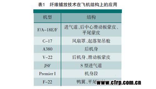 自動(dòng)纖維鋪放技術(shù)是飛機(jī)復(fù)合材料構(gòu)件自動(dòng)化成型的關(guān)鍵制造技術(shù)之一,其又可細(xì)分為自動(dòng)纖維絲鋪放技術(shù)和自動(dòng)纖維帶鋪放技術(shù)。前者適用于平面型或低曲率的曲面型,或者說(shuō)準(zhǔn)平面型復(fù)合材料構(gòu)件的鋪層制造;后者綜合了自動(dòng)纖維纏繞與自動(dòng)纖維帶鋪放兩者的優(yōu)點(diǎn),可實(shí)現(xiàn)復(fù)雜曲面型復(fù)合材料構(gòu)件的鋪層制造。表1中列出了纖維鋪放技術(shù)在飛機(jī)結(jié)構(gòu)上的應(yīng)用情況[1]。