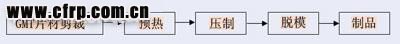 與SMC相似,GMT也是采用金屬對(duì)模的模壓成型工藝,所不同的是SMC的固化成型是化學(xué)反應(yīng),而GMT的冷卻成型是物理變化,成型所要求的工藝參數(shù)和對(duì)壓機(jī)、模具的技術(shù)要求是不相同的。GMT成型工藝的特點(diǎn)是:片材必須先預(yù)熱(加熱至220~230℃),成型壓力高(10~25Mpa),成型溫度低(35~50℃),成型周期短(30~60s)。GMT模壓成型工藝流程如圖14所示。