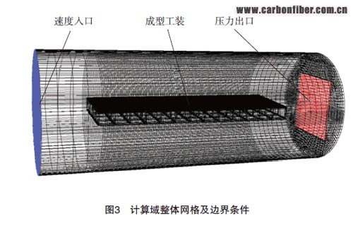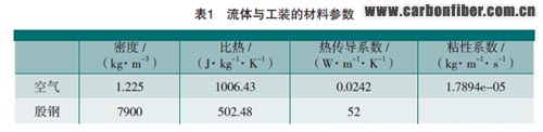 由經(jīng)驗(yàn)和工藝試驗(yàn)可知工裝的變形均在毫米量級(jí),工裝的尺寸在幾米至十幾米,工裝結(jié)構(gòu)變形不會(huì)對(duì)熱壓罐內(nèi)的氣體流動(dòng)產(chǎn)生明顯影響。由于流體計(jì)算對(duì)網(wǎng)格要求較高,文中使用專業(yè)流體仿真軟件FLUENT進(jìn)行工裝及熱壓罐內(nèi)整個(gè)流場(chǎng)的網(wǎng)格劃分,如圖3所示。對(duì)工裝建立的有限元模型既可以適用于溫度場(chǎng)的計(jì)算,也可以用于工裝的結(jié)構(gòu)變形計(jì)算。熱壓罐工藝規(guī)范簡化如圖4所示,溫度場(chǎng)計(jì)算所用相關(guān)材料參數(shù)如表1所示。