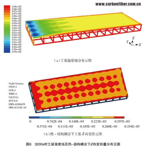 在復(fù)合材料的熱壓罐固化過程中,對(duì)柱支撐形式的固化工裝型面,溫度不均勻性導(dǎo)致的型面翹曲變形較為復(fù)雜。在工裝結(jié)構(gòu)內(nèi)部,支撐柱存在位置所對(duì)應(yīng)型面的局部變形量大于沒有支撐柱存在的位置,這是因?yàn)橹沃鶎?duì)空氣的擾流作用加快了支撐柱與周圍空氣之間的熱傳遞。圖8為3200s時(shí)工裝溫度場(chǎng)及Z向結(jié)構(gòu)變形量分布云圖。