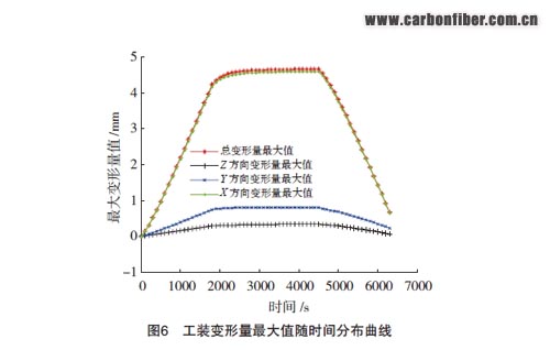 復(fù)合材料在熱壓罐中固化分為3個(gè)熱歷程:升溫、恒溫和降溫,此過程中工裝溫度場(chǎng)分布的不均勻性導(dǎo)致各部分熱應(yīng)力分布不均勻,工裝在熱應(yīng)力和自重載荷耦合作用下產(chǎn)生變形。熱歷程中工裝變形量最大值分布如圖6所示,從圖中可得出:
