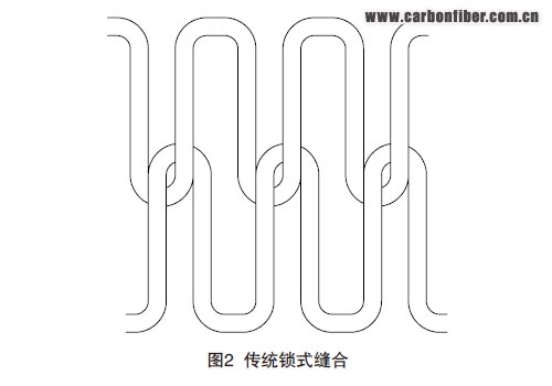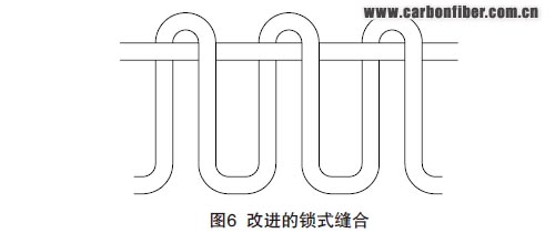 (1)鎖式縫合(改進(jìn)鎖式縫合)。因其工藝性較好在復(fù)合材料預(yù)制體研制中得到廣泛使用。傳統(tǒng)鎖式縫合方式較常見,其特點是縫線和底線的結(jié)點在制件厚度的中間位置,這對于復(fù)合材料來說,結(jié)點處的應(yīng)力集中很大程度上會影響復(fù)合材料性能的提高。因此,在傳統(tǒng)鎖式縫合的基礎(chǔ)上進(jìn)行工藝優(yōu)化,出現(xiàn)了改進(jìn)鎖式縫合,圖6即為改進(jìn)的鎖式縫合。在復(fù)合材料縫合中,改進(jìn)鎖式縫合應(yīng)用較多,使用此縫合方式制件在厚度方向縫合線彎曲少,對面內(nèi)纖維的損傷少,由縫合引起的應(yīng)力集中也較小,因此使復(fù)合材料具有相對更高的損傷容限。 內(nèi)容來自123456