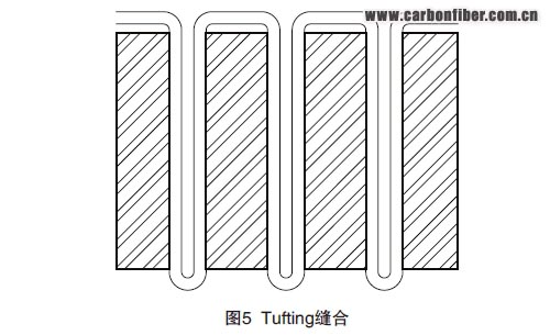 (3)Tufting縫合。同樣是依靠連接縫頭的懸臂機(jī)械手上完成復(fù)雜型面的縫合,在縫合時Tufting縫針只有在預(yù)制體內(nèi)穿進(jìn)和退出的簡單動作,所以Tufting縫合可適用于較厚的預(yù)制體縫合,Tufting縫合的最大縫合厚度可達(dá)30mm。采Tufting