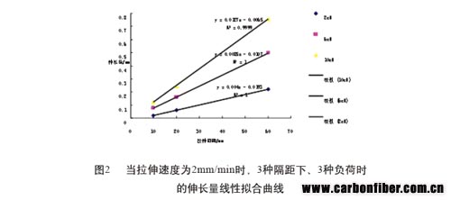 從圖3可以看出,拉伸速度在2mm/min下,找到當拉伸隔距為零時的系統(tǒng)所產(chǎn)生的伸長量??梢钥闯霎斃旄艟酁榱銜r,系統(tǒng)隨著受力的增大,伸長量也是在逐漸增大的,而且也呈線性關系。