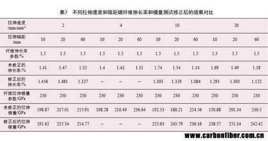 最后可以根據(jù)線性回歸后的分析結果,對測試讀出的數(shù)據(jù)進行修正。將系統(tǒng)受力產(chǎn)生的伸長量剔除,得到碳纖維真正的伸長率和模量等力學指標,見表3。