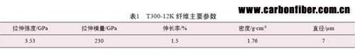 試驗采用市售商品日本東麗公司聚丙烯腈( PAN) 基碳纖維,牌號 T300B-12K,簡稱 T300,它是國際公認的通用級標準碳纖維,性能參數(shù)見表1。