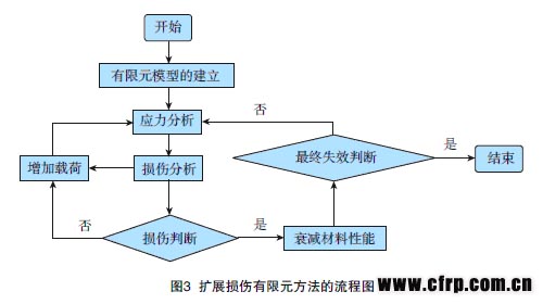 挖補修理有限元研究方法在過去的20年里取得了很大的發(fā)展。已經(jīng)從過去簡單的2維研究發(fā)展為3維有限元仿真研究。材料的失效判斷也從過去簡單判斷破壞與否的蔡-吳、蔡-希爾失效判據(jù)發(fā)展完善為目前常采用的能夠區(qū)分材料多種不同失效模式(纖維斷裂、基體開裂、纖維-基體剪切破壞和分層破壞)的Hashin失效判據(jù)。目前,修理結(jié)構(gòu)有限元仿真研究的最常用方法為擴展損傷方法。圖3即為擴展損傷方法的運算流程圖。 copyright 123456