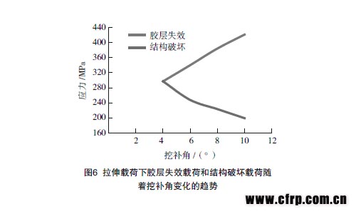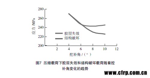 隨著挖補修理研究的不斷發(fā)展,目前最新的研究結(jié)果表明:挖補修理結(jié)構(gòu)的失效包括膠層的失效和結(jié)構(gòu)的破壞,而挖補角對膠層失效和結(jié)構(gòu)破壞的影響并不相同。如圖6所示,隨著挖補角度的增大,膠層的失效載荷在不斷減少而結(jié)構(gòu)的破壞載荷卻在不斷增加。4°時膠層的失效載荷與結(jié)構(gòu)的破壞載荷相同,此時的角度即為拉伸載荷下挖補修理的最佳挖補角。通過研究,同樣也可以得到壓縮載荷下膠層失效和結(jié)構(gòu)破壞載荷隨挖補角變化的趨勢(圖7),并得到壓縮載荷下挖補修理的最佳挖補角6°。與試件受到單一拉伸載荷或壓縮載荷不同,一般實際修理結(jié)構(gòu)使用時即會受拉伸載荷也會受壓縮載荷,因此綜合考慮可以得到飛機修理結(jié)構(gòu)的最佳挖補角為6°。