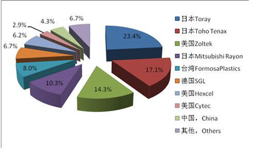 圖:2009年全球碳纖維廠商產(chǎn)能占比(按碳纖維絲束產(chǎn)能計)