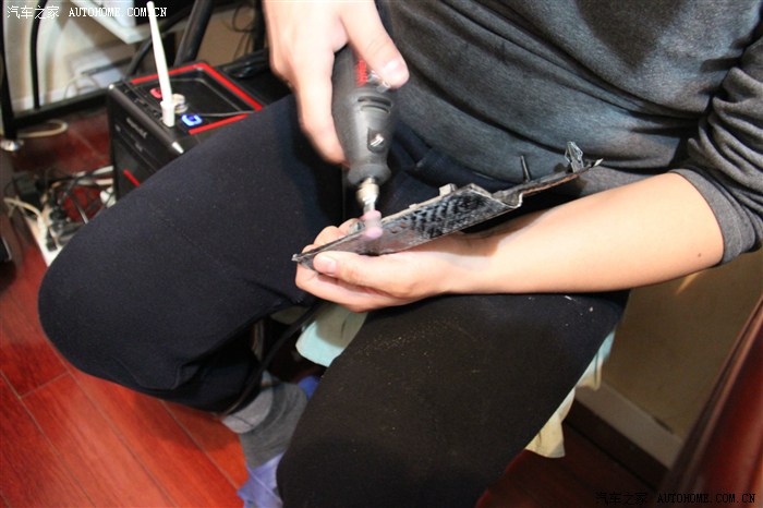 又經(jīng)過(guò)一夜加一白天的等待,樹(shù)脂層也干透了,電磨工具就可以派上用場(chǎng)了,首先用剪刀把能剪的多余地方都剪掉,然后用電磨加上砂輪片摳孔和打磨邊緣。